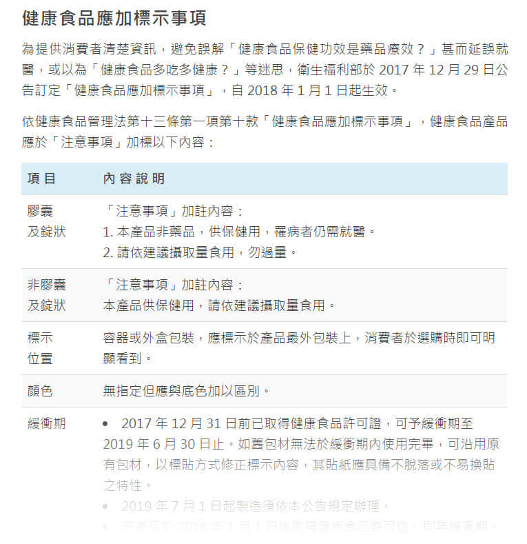 衛福部在2017年針對保健食品的包裝有特別公佈了食品衛生管理法的第十三條第一款第10項『健康食品應加標記事項』中特別說明了許多明確的規範,明確指出許多營養標示的各種內容標準。