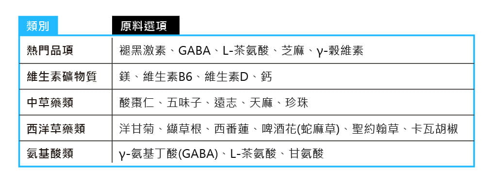 去年起,我們彙整分析睡眠保健食品相關原料資訊、加上針對市場較具曝光度的商品類型進行研究,共彙整出五個類型的原料取向,分別為市場熱門原料、維生素礦物質、中草藥、西洋草藥、萃取成分。